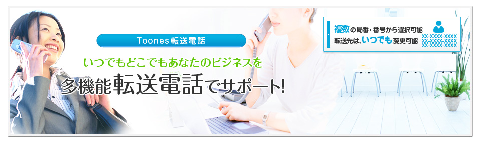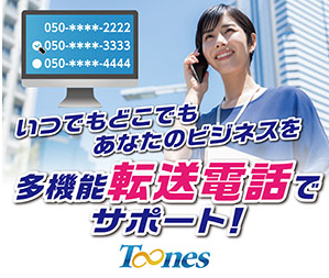 電話転送サービスToonesは、会社や店舗の電話を別の電話番号へ転送できるサービスです。